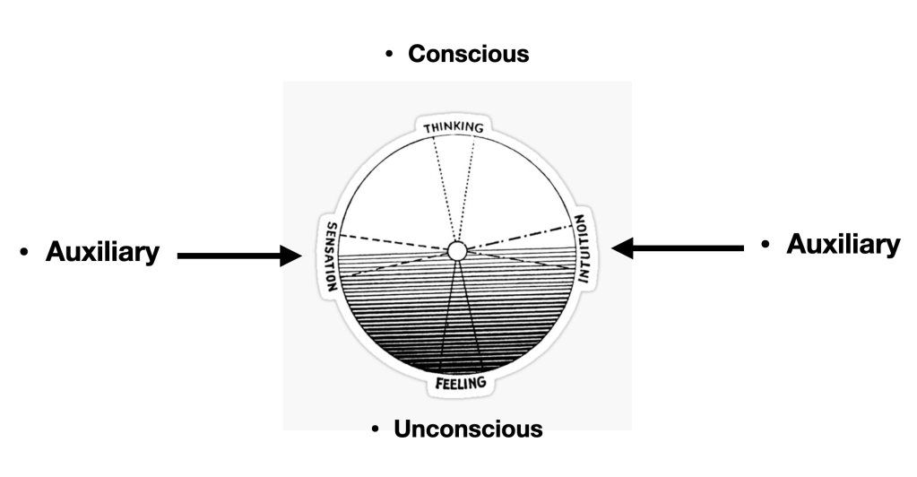 Figure 2. The four functions as formulated by Carl Jung. I have added emphasis on the light (conscious), dark (unconscious) and auxiliary functions to emphasize how the three are visible, although the auxiliary actually share the light and the dark. It is interesting to observe that it every action and thought develops the exact opposite within our unconscious and this can confuse if not understood. The main point of the article is to emphasize that the functions are like north, south, west and east on a compass. Therefore they are ways of understanding and navigating consciousness from within, which eventually should lead to the Kingdom within and possessing the 12 powers of the disciples, which are the manifested form of the functions in actuality both in thought and action.