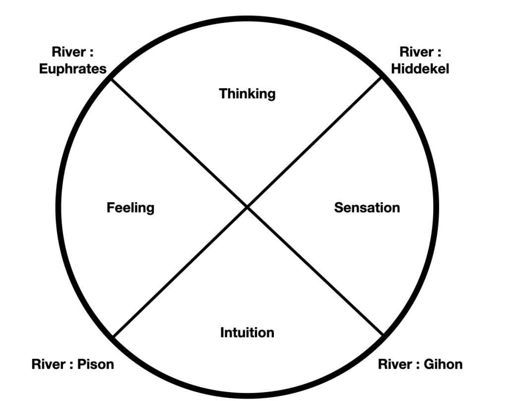 Figure 3. It is my greatest honor to shed light on the deepest symbol of our ancestors. The four rivers mentioned in Genesis chapter 2 is not only aware of the four functions of consciousness, but while the book lays the symbolism out it simultaneously explains what lies beyond the functions in a spiritual form. Hopefully I will write an more in-depth article on these four rivers because this is some of the deepest stuff I have encountered. I hope you get the gist of it, but each river is also a symbol for something important. I can only refer to Genesis 2:10. I don’t think it is a coincidence that the verse and chapter number add up to twelve.