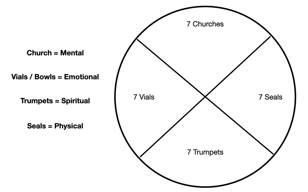 Symbolically the seven churches (air) are aggregations of spiritual thoughts in individual consciousness working in different functions that work as a wall against material yearnings and holds true to spiritual thoughts. The 7 seals (earth) are the functions of the body and the mind in a state of sin where they are separated from a union and can be united by letting the water run like the four rivers of Eden. The 7 trumpets represent the harmonious waves that unite the 7 within. The 7 vials or bowls are the containers of water that symbolize the unconscious content which is poured unto the earth, the sun, the sea and into the air. This hints at the process where one is spiritually organizing oneself and how the body and mind connects at a higher level. There is a lot more subtle symbolism in the book, but this may give some insight on the relation between how consciousness communicates with the body.