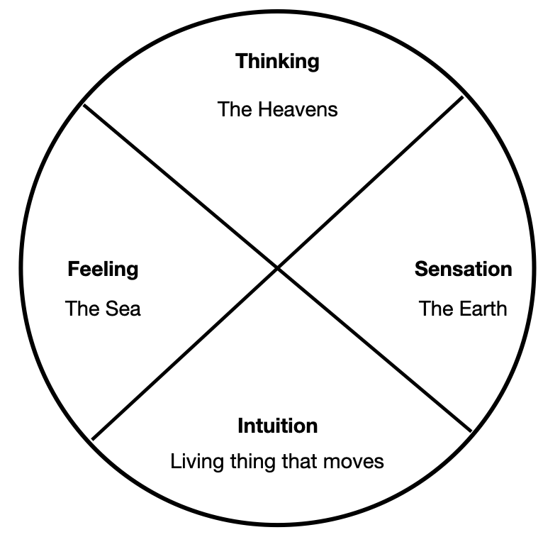 Genesis 1:28 reads: ”Be fruitful, and multiply, and replenish the earth, and subdue it; and have dominion over the fish of the sea, and over the birds of the heavens, and over every living thing that moveth upon the earth.” God therefore wanted us to have dominion of the four states of consciousness which are thinking (the heavens), feeling (the sea), sensation (the earth) and intuition (every living thing that moveth). Intuition is a bit harder to explain, but basically movement creates time and therefore intuition is a function that can compile past experiences with future predictions of reality, and is therefore a wisdom of the heart. It is a sort of inner knowing, and this is where we can reside in consciousness to immediate apprehension of spiritual truth without needing intellectual affirmation.